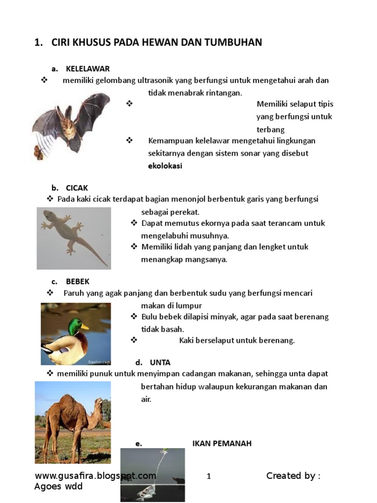 1 Ciri Khusus Pada Makhluk Hidup Ciri Khusus Hewan Penjelasan dan Gambarnya. Kelelawar Cicak Bebek Dan Ciri Cirinya posted. Tumbuhan maupun hewan sama-sama memiliki ciri khusus sesuai dengan tempat hidup maupun makanannnyaDalam video ini dijelaskan beberapa ciri khusus hewan sepe.